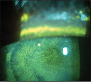 Note the pattern of corneal epithelial migration to fill in the braded area in this healing cornea.