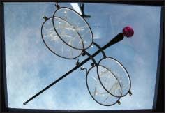 If you believe in serendipity, as I do, this find was no mere coincidence. For many years, I've been using beach glass to make translucent mosaics similar to stained glass pictures. I use a clear silicone adhesive to attach the smooth and colored glass pieces to a separate sheet of glass. One problem I kept encountering: outlining the contours of the object I molded in the sheet of glass. I'd tried black paint and sheets of adhesive black plastic, but these materials looked too thick against the illuminated glass. My "dragonfly" find, however, got me thinking I could solve this problem with spectacle frames and lenses, while adding a new level of optics to my work.