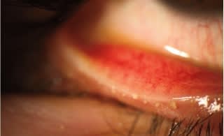 Moderate turbidity (granularity of the secretions) is seen in both eyes. Photos courtesy of Katherine M. Mastrota, MS, OD, FAAO, New York, NY