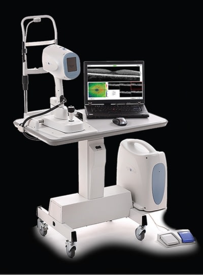 It differs from the RTVue, however, in that it's mounted on a standard slit lamp-style base (you can mount it to a small table as well), and it is comprised of a small scanning head (5 lbs), a control module, laptop PC and foot switch.