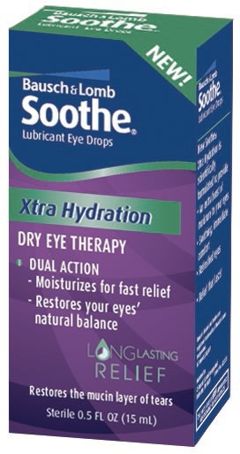 The Soothe Extra Hydration lubricant eye drops moisturize and restore the deficient aqueous and mucin layers, Bausch + Lomb says.