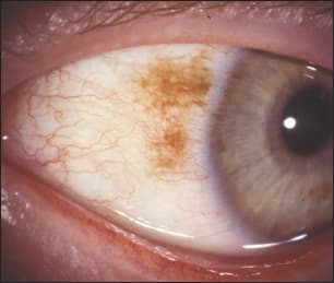 Primary acquired melanosis as viewed through an anterior segment camera. COURTESY CHRISTINE W. SINDT, O.D.