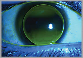 Figure 2: A bitoric GP lens with appropriate toricity, but showing central touch. Both the flat and steep base curves of this lens should be steeper to achieve an appropriate fit.