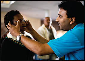 Prof. Naidoo fits spectacles on a child in Soweto, South Africa.