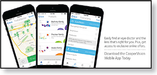 ■ CooperVision has created a Consumer Mobile App for iOS and Android devices that offers consumers features such as a lens replacement reminder, an ECP locator and content that covers contact lenses, vision and eye health. To download the app, visit the Apple Store, Google Play or http://bit.ly/V7xWN8.
