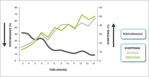 A recent study suggests that almost 60% of contact lens wearers experience declining performance during the day, with vision, comfort and satisfaction going down as feelings of dryness and tiredness increase (Figure 1).1 What’s more, the pattern of decline isn’t always steadily downward, but can fluctuate from one hour to the next. This is confusing to patients, who may not associate their inconsistent vision or comfort with particular settings or activities. And it matters a great deal. The more patients struggle in some situations, the more likely they are to shorten the number of hours of contact lens wear or temporarily discontinue lenses, potentially leading to dropout.2,3