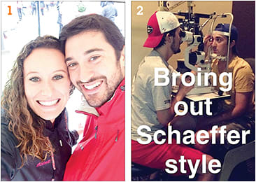 1: Mark Schaeffer with fiancé, Sarah. 2: David practices an eye exam on Mark in this “edited” photo.