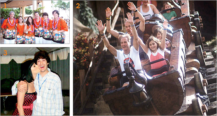 1: The Schaeffers in Hawaii. 2: Dr. Schaeffer-Kaplan’s children riding the Seven Dwarfs Mine Train at Disney World with their grandfather. 3: Mark Schaeffer with Katy Perry at the 2009 Schaeffer Eye Center Crawfish Boil.