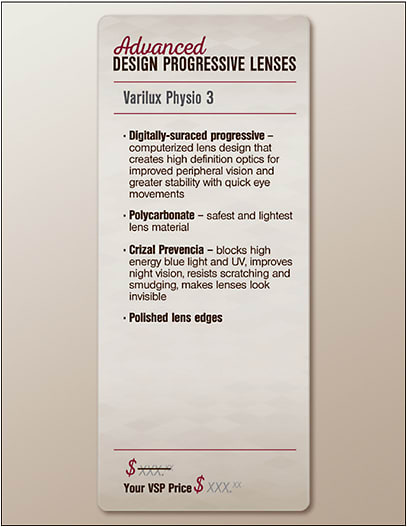 Now, create your second tier package. Choose your second favorite PAL, pick the lens material and choose a coating that has fewer features than your best coating. Price this package about 20% to 30% less than your best lens package. We call this package our “Advanced Design Lens Package.”