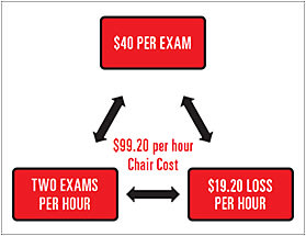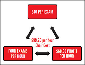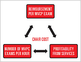 If a MVCP reduces its reimbursement per exam and you don’t increase your volume of patients per hour, then your profit from your services will decrease as well. Let’s show you two scenarios (see Figures 3, 4, 5 and 6) that assume your practice has a chair cost (more on this in minute) of $99.20 (or about the national average).