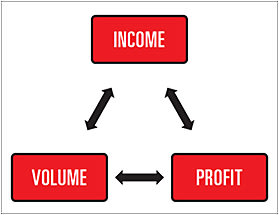 Based on Figure 1, it is pretty easy to see the direct impact income, volume and profit have on each other. If income is high and volume is constant, then profit will remain constant. However, if income falls and volume remains constant, the profit has nowhere to go except for down. Now, let’s look at the same diagram a little differently. See Figure 2.