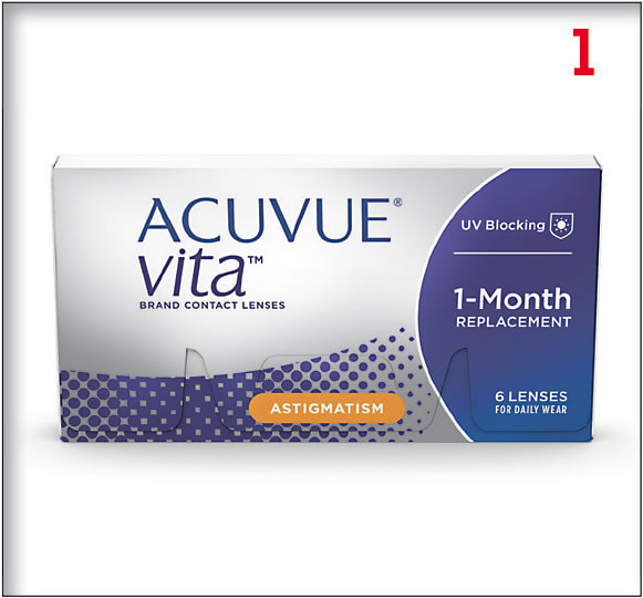 Acuvue Vita for Astigmatism, from Johnson & Johnson Vision, is a daily wear monthly replacement contact lens made of senofilcon C with proprietary Blink-Stabilized Design and HydraMax Technology. Its parameters: an 8.6mm base curve, 14.5mm diameter, in powers +0.00D to -6.00D (in 0.25D increments), cyl -0.75D, -1.25D, -1.75D, -2.25D, axis: 10° to 180° in 10° increments (-2.25D cylinder is available in 10°, 20°, 70°, 80°, 90°, 100°, 110°, 160°, 170°, 180° axes only); and +0.25D to +4.00D (in 0.25D increments) -6.50D to -9.00D (in 0.50D increments) cyl: -0.75D, -1.25D, -1.75D, axis: 10°, 20°, 70°, 80°, 90°, 100°, 110°, 160°, 170°, 180°. ■