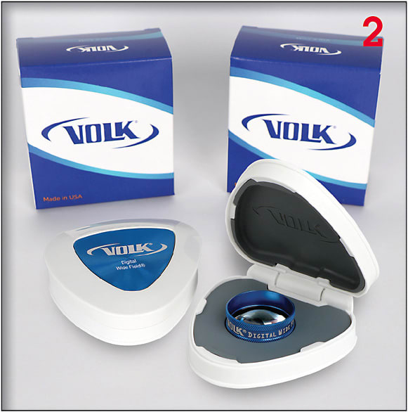 An ophthalmic lens case, from Volk Optical, has been engineered to withstand 50,000 openings without hinge breakage. A thermoplastic rubber insert cushions the lens; a magnetic closure holds the case shut. ■