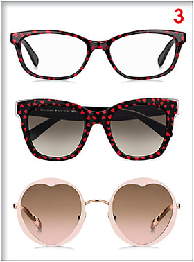Kate Spade New York released its spring/summer 2018 Valentine’s Day capsule collection. It includes two sunglasses and one optical frame. The first sunwear is round with, a metal heart-shaped front and is available in red/brown, pink/brown and black/gray-shaded lenses. The second sunwear is square with a cat eye effect and heart pattern. A rectangular optical frame is also offered with acetate front and temples covered in a heart pattern. ■