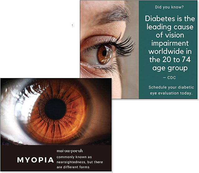- Take the definition of a public health issue and a compelling image, such as the treatment for myopia seen here. Explain what your practice can do to help in the caption. Don’t forget your call to action to schedule an appointment.
