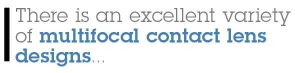 There is an excellent variety of multifocal con-tact lens designs to fit most of our presbyopic patients. I often let these patients try on a pair in the office, and then I provide a couple of dailies for them to try at home. Often, they return to purchase a year’s supply. (For additional information on fitting multifocals, visit https://bit.ly/OM21JanFeb MultifocalCLs.)