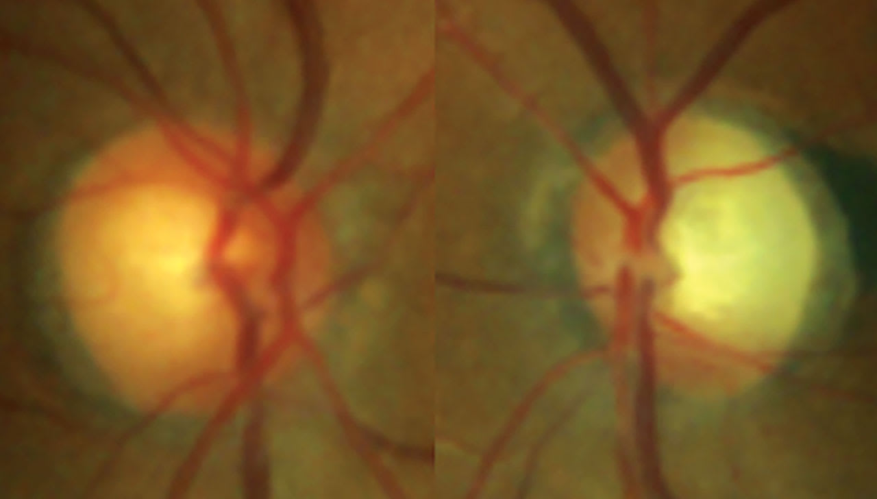 • Onset and progression. Glaucoma commonly has a slow, gradual decline. NGONs often present as sudden onsets of symptoms, such as a decline in vision or VF over hours to days and, in some cases, are accompanied by other symptoms. Optic atrophy due to optic neuritis is an example. It can present with vision loss accompanied by blurry vision, pain from eye movement, and decrease in contrast.