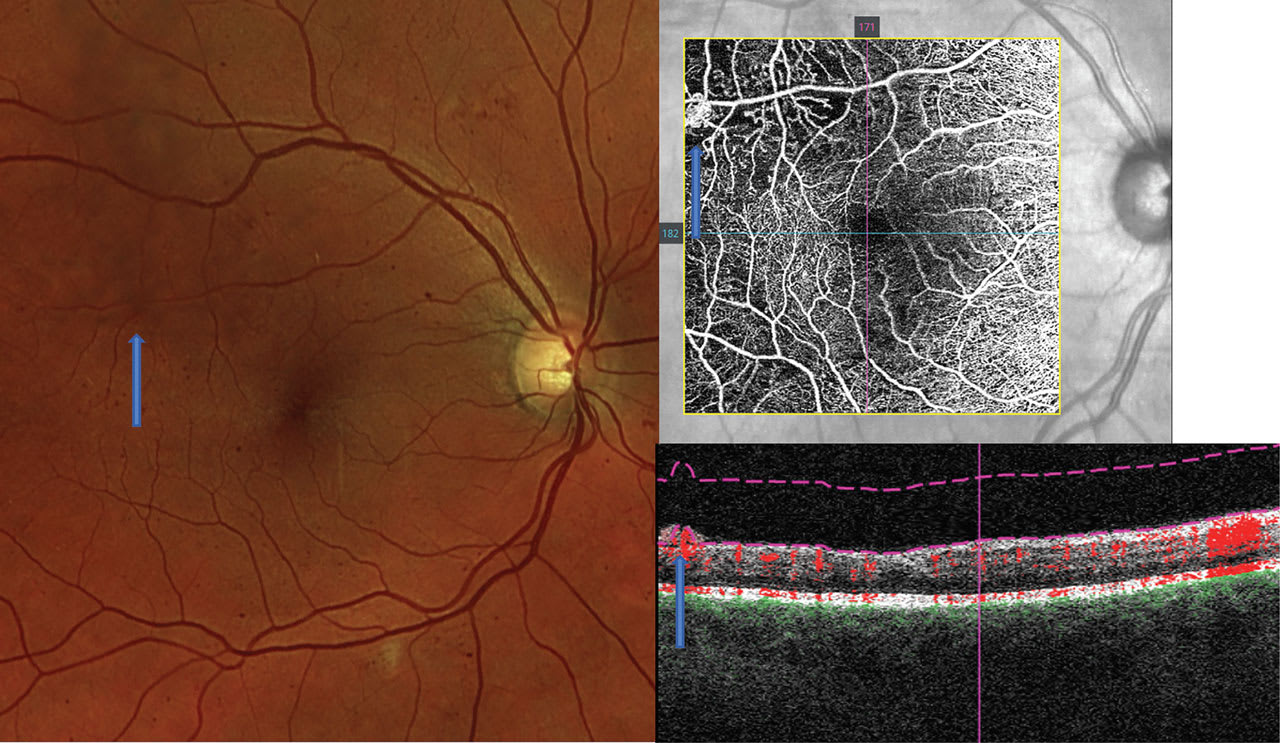 Next, the clinician should review the OCT-A for microaneurysms and anomalous vessels, which are typically hyper-reflective on the capillary plexus slabs, as long as there is sufficient blood flow through the anomalies8 (Figure 2). If there are concerns for proliferative disease, OCT-A is also helpful in discriminating intraretinal microvascular anomalies from neovascularization (NVE): On OCT-A B-scans, NVE breaches the vitreoretinal interface, which differentiates the two (Figure 3).