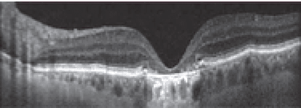 These vitelliform lesions in AOFVD result from a buildup of lipofuscin, the product of undigested photoreceptor outer segments. The lesions may gradually enlarge, and then decrease in size, resulting in an atrophic RPE and visible disruption in the IS/OS interface (see Figures 3a and 3b).7 Photoreceptors are susceptible to photo-oxidative damage, while phagocytosis by the RPE prevents toxic accumulation of damaged material in a healthy retina.8