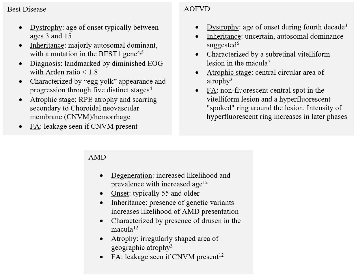 When evaluating cases such as this, there are a few key factors to consider, including the age of onset, severity and description of the presentation, laterality, visual function and genetic markers. The extent of the maculopathy combined with the patient’s relatively young age suggested macular dystrophy as a more plausible etiology than true AMD.2 Given this patient’s history and clinical presentation, Best disease and Adult-onset Foveomacular Vitelliform Dystrophy (AOFVD) were high on the list of our differential diagnoses (see Figure 1).