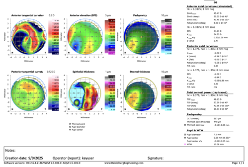- Epithelial thickness map: revealed compensatory thickening over areas of stromal loss, a well-documented adaptive response but one that further compromises smooth optics.