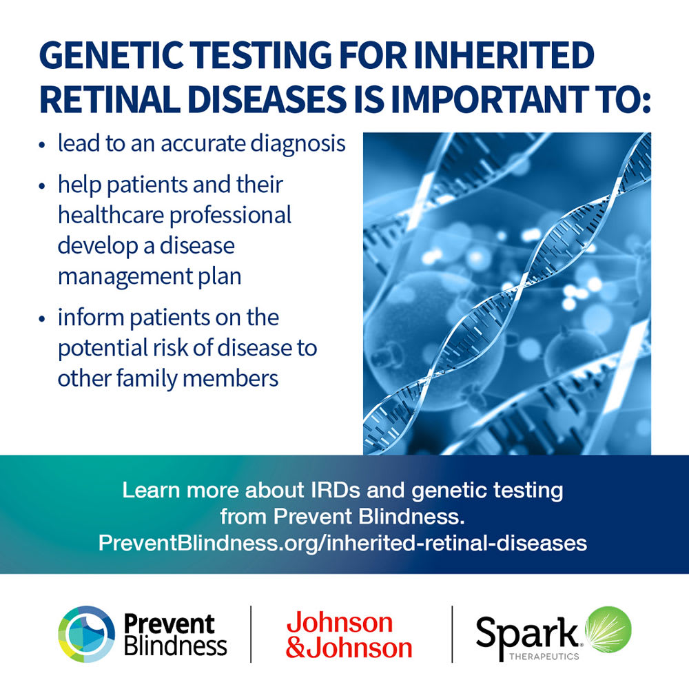 Prevent Blindness has declared May as its first-ever Inherited Retinal Disease Genetic Testing Awareness Month. The initiative is sponsored by Johnson & Johnson and Spark Therapeutics. The goal of the program is to provide education to the public about Inherited Retinal Diseases (IRD) and the important role of genetic testing. Free fact sheets in English or Spanish, a dedicated web page, and shareable social media graphics are available. More information can be found here. A webinar, “Pathway to Diagnosis: Genetic Testing for Inherited Retinal Diseases,” will be held later in the month as well. Free registration for the webinar is here.