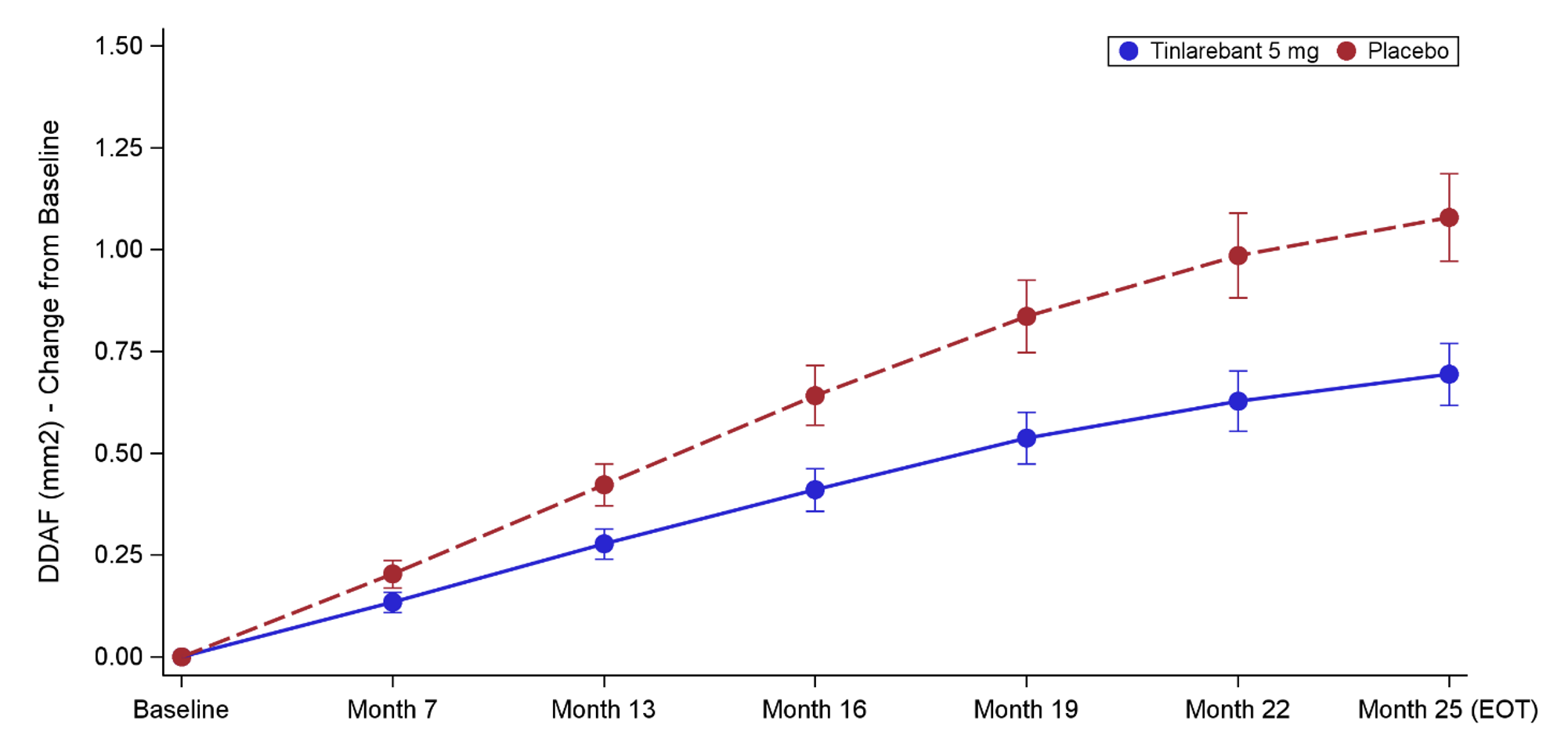 The company also says a statistically significant treatment effect was also observed in the fellow eye for the primary endpoint with 33.6% lesion growth reduction (P=.041). In addition, tinlarebant slowed decreased autofluorescence (DAF) lesion growth, the key secondary endpoint calculated as the sum of DDAF and questionably decreased autofluorescence (QDAF), in the study eye by 33.7% (P=.027) and in the fellow eye by 32.7% (P=.017).