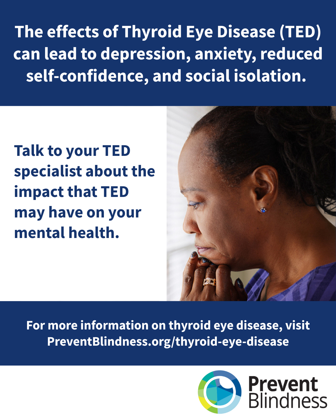 Additionally, in a TED patient testimonial video, “Thyroid Eye Disease: Susan's Story,” a patient shares her experience with TED, including how an eye exam led to her TED diagnosis: Prevent Blindness ASPECT Patient Engagement program.